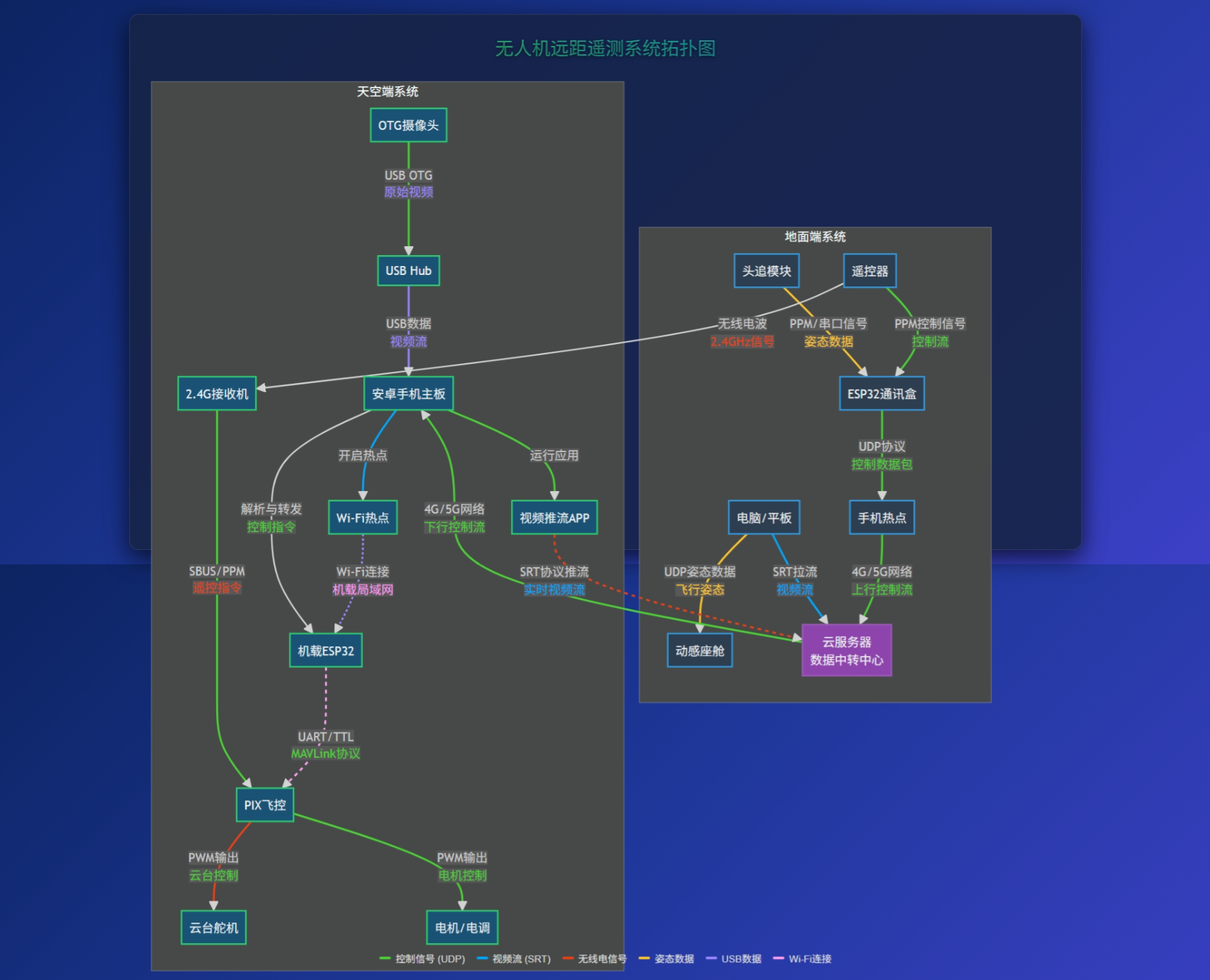 目标是利用4G LTE网络替代传统的2.4GHz/900MHz无线电链路,实现固定翼航模的超视距(BVLOS)控制、遥测数据回传(数传)、实时视频传输(图传),以及六轴动感座舱的姿态反馈。